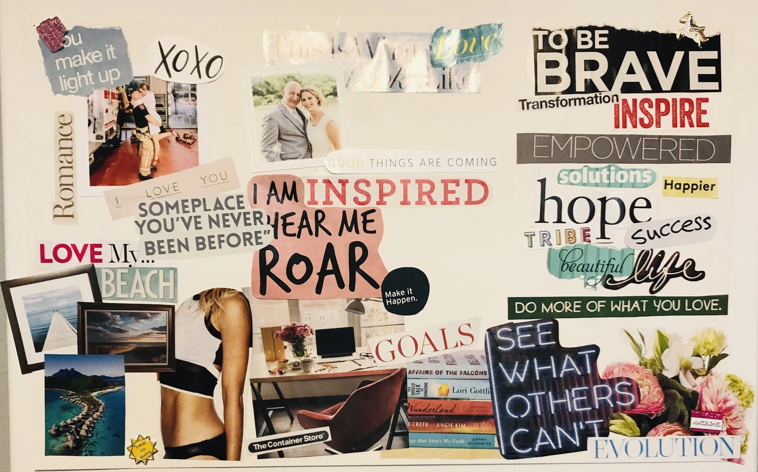 Photos or images that represent or remind you of your goals or dreams such as a photo of you and your husband on your favorite vacation (back when vacations were a thing) that reminds you what it felt like to be in paradise. It could also be a photo of your bosses office that you want to move into one day.