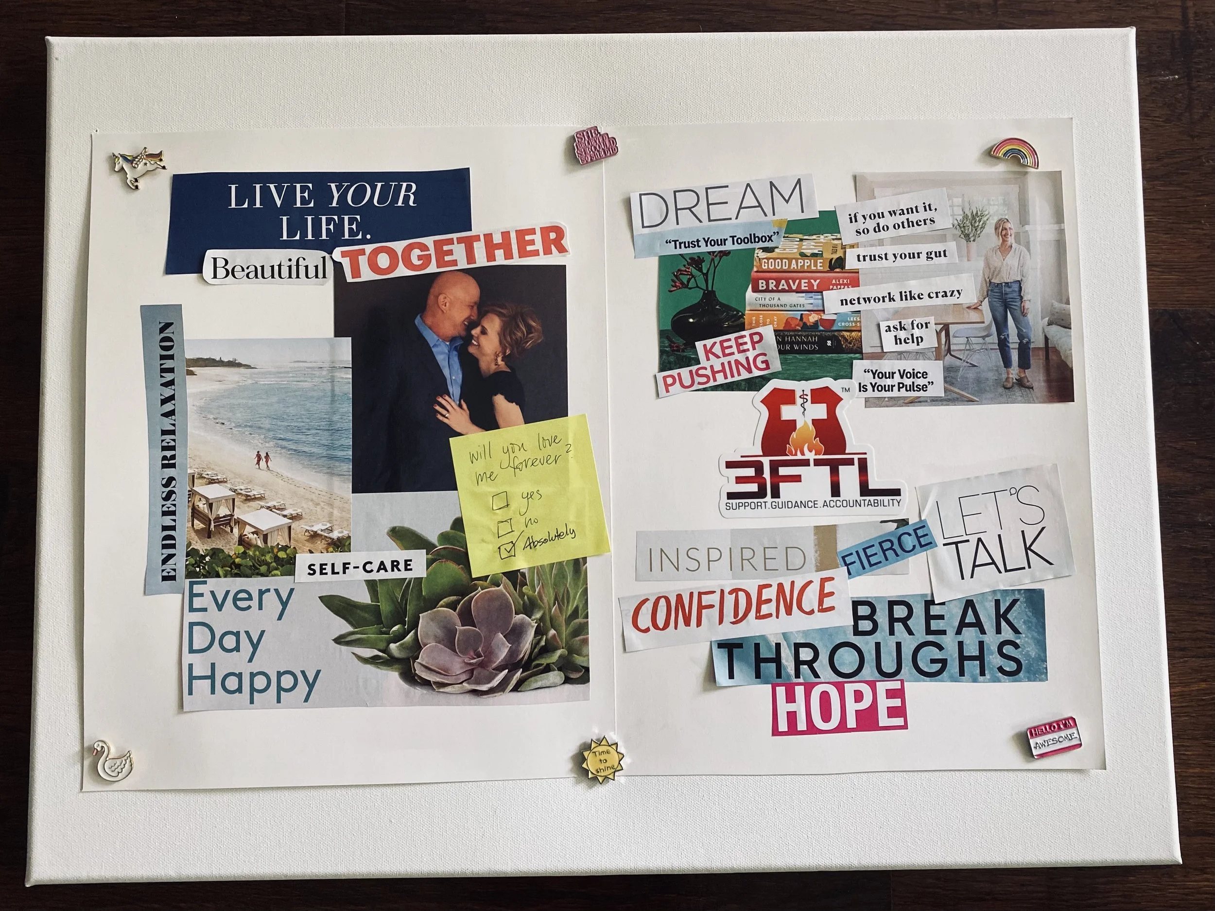 A Vision Board is a sacred place where you capture what you truly want in life. It’s a collage of images and words that represents your goals, your dreams and your aspirations. It kick starts your imagination and gives you a clear picture of where you want to go. It’s equal parts heart-work and DIY fun. Besides that, you get dedicated time for YOU to FOCUS ON YOU!